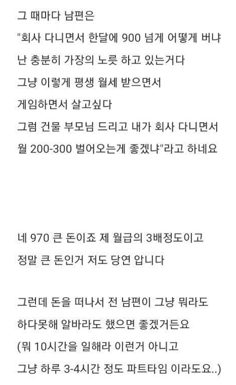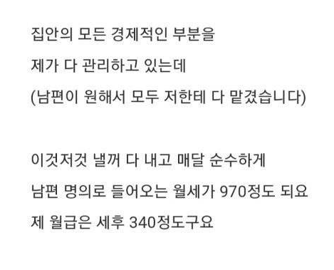 뭐... 하..." A씨는 "집의 금전적인 부분은 내가 다 알아서(남편이 원한다고 했다) 이것저것 낸다. 월세는 순전히 남편 명의로 970만원 정도다. 내 월급은 세후다. 340만원 정도다. 네"라고 경제적인 부분을 설명했다.