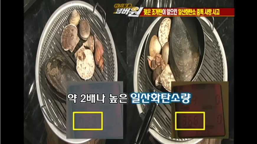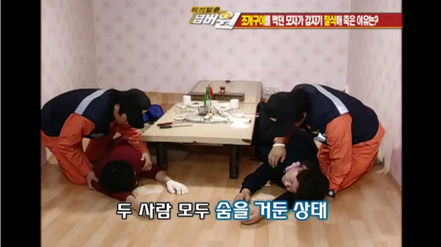 작은 방에서 조기구이를 먹는 진우 씨의 경우, 환기 부족으로 인해 연기가 발생하면서 창문을 닫을 수 없다는 엄마의 만류에도 환풍기가 있어서 문을 닫았습니다. 하지만 식사를 시작한 후 2시간이 지나도 방에서 나오지 않는 두 사람을 이상하게 여긴 종업원이 방문을 열어보자, 조개구이를 맛있게 먹던 모자는 하얀 거품을 내며 쓰러져 있었습니다.