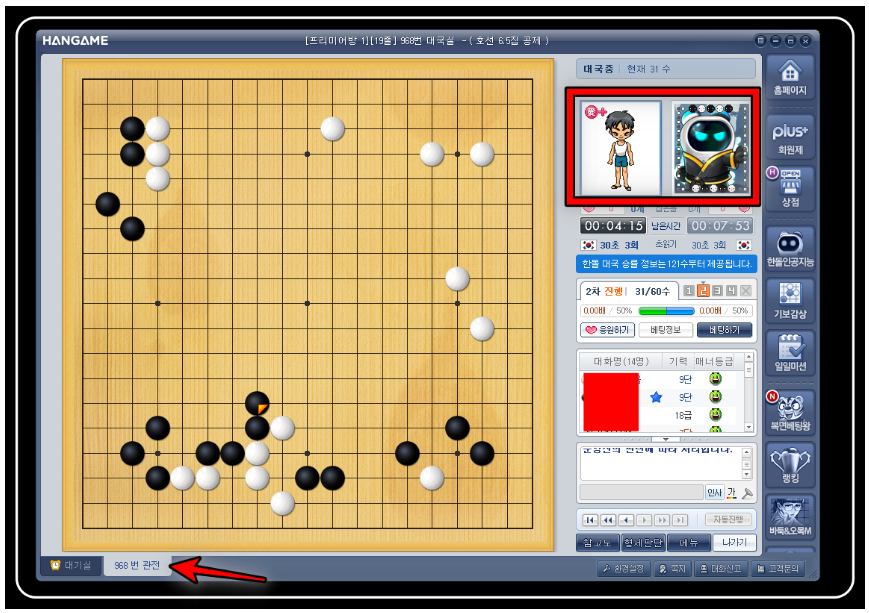 ▼바둑 화면이 나타납니다. 그래픽을 참고하면 됩니다. 현재는 관전 모드입니다. 경기 화면과 동일합니다. 이렇게 게임을 즐기면 됩니다. 한돌이와 대결 중입니다. 정말 잘하고 있습니다. 급수가 있기 때문에 이기기 어려울 수 있습니다. 물론 차이는 있습니다. 이렇게 게임을 즐기면 됩니다.
