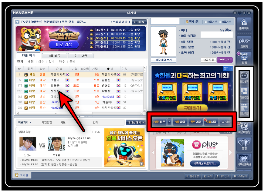 확인 후 참가하세요. 그리고 화살표를 누르면 원하는 방으로 바로 관전할 수 있습니다. 즐겁게 관전하세요. 빠른, 바로대국, 19줄, 9줄 등의 버튼이 아래에 있습니다. 누구나 사용할 수 있습니다. 아주 간단합니다.