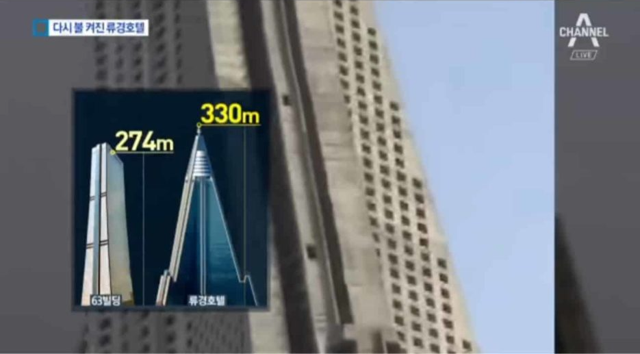 이 호텔은 남한의 63빌딩을 앞서기 위한 목적으로 건설되었습니다. 프랑스에 공사를 의뢰할 때부터 63빌딩보다 높은 100층짜리 호텔을 지어달라는 명령을 내렸습니다.