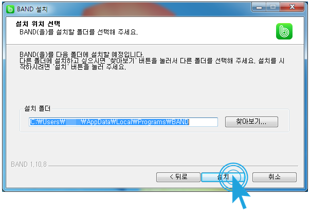 5단계: 밴드를 설치할 위치를 선택하는 화면입니다. 다른 위치를 선택하지 않으려면 기본값을 그대로 사용하여 '설치' 버튼을 클릭하십시오.